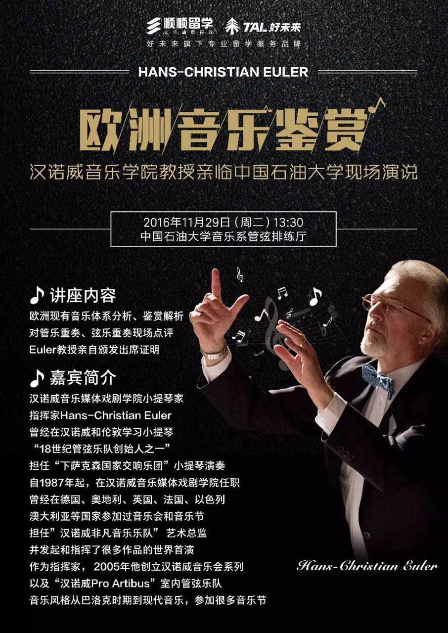 讲座人简介:Hans-Christian Euler,汉诺威音乐媒体戏剧学院小提琴家、指挥家。曾经在汉诺威和伦敦学习小提琴。1981年,他是“18世纪管弦乐队创始人之一(指挥Frans Brüggen)”。自1983年起,他担任“下萨克森国家交响乐团”小提琴演奏,自1987年起,在汉诺威音乐媒体戏剧学院任职。作为一名小提琴家,他曾经在德国、奥地利、英国、法国、以色列和澳大利亚等国家参加过音乐会和音乐节。1994年,担任”汉诺威非凡音乐乐队” 艺术总监,演出了经典的当代音乐作品,并发起和指挥了很多作品的世界首演。作为指挥家,2005年他创立汉诺威音乐会系列,以及“汉诺威Pro Artibus”室内管弦乐队,同时他指挥过很多音乐会,音乐风格从巴洛克时期到现代音乐,参加很多音乐节(如:汉诺威海伦豪森皇家园林音乐周,佩皮尼昂音乐节、诺曼底音乐节、佩皮尼昂欧洲周、波兹南莫扎特音乐节、下萨克森音乐节等)。2015年他在汉诺威首演了韩国和日本作曲家的作品,以纪念韩国作曲家Isang Yun 。