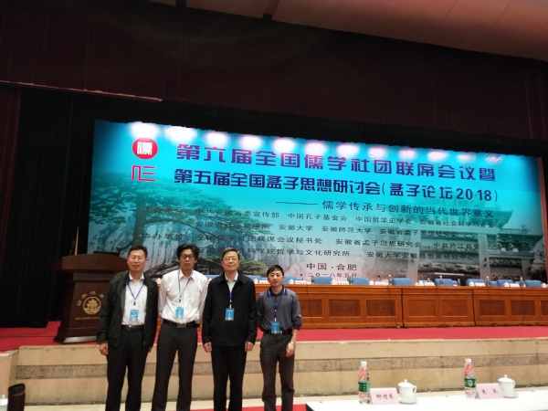 5月10日-13日,第六届全国儒学社团联席会议暨第五届全国孟子思想研讨会(孟子论坛2018)在安徽省合肥市召开,安徽省人大常委会原主任孟富林,安徽省政协副主席李修松,全国儒学社团联席会议秘书长、浙江省儒学学会会长吴光,安徽大学党委书记李仁群,中国哲学史学会副会长、《中国哲学史》主编李存山等出席开幕式并致辞,来自全国各省市自治区的50余个省级、市级儒学社团和境内各地及港澳台300余位代表学者参加了研讨。与会专家学者共同围绕“儒学传承与创新的当代世界意义”的大会主题,分别就“儒学与全人类共同价值”“儒学与人类命运共同体”“儒学与中国话语体系”“儒学与中国方案”“儒学的大众化和地域化研究”“马克思主义与儒学的会通”以及孟子思想与亚洲儒学、孟子思想与文化自信、孟子思想与现代文明、孟子思想的传承与发展等关于孟学的历史与未来的问题进行交流研讨。会上通过申办陈词、代表投票决定第七届儒学社团联席会议将于2019年在云南举办。