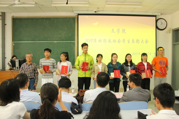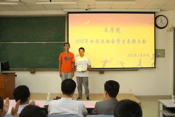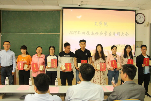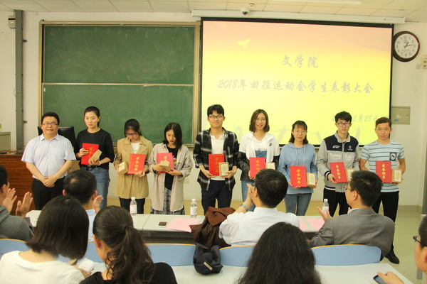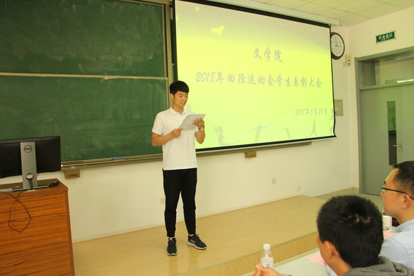 为传承运动健儿敢于拼搏、优秀志愿者乐于奉献的精神,并加强文学院学生体育运动锻炼意识,文学院于5月28日在南教楼106室举行文学院2018年田径运动会学生表彰大会。本次表彰大会由学院团委书记赵振华主持,党委学生工作部副部长陈文军、校团委副书记石国卿、体育教学部副主任王海滨、体育教学部教师史海鹏、文学院院长王学栋、党委书记张永宁、党委副书记邹维忠受邀出席,文学院辅导员、参赛运动员、运动会志愿者、全体党员、班委会成员以及体育运动爱好者参加。
