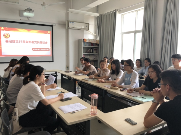 恰逢建党97周年之际,为培养文学院青年大学生党员的爱党、爱国、爱校情怀,坚定政治信仰,继续深入学习贯彻党的十九大精神,文学院学生党建工作中心于6月21日下午在306会议室组织召开以“不忘初心感恩党情”为主题的新老党员座谈会。文学院学生党建工作中心主任韩丙华、各支部书记及新一批预备党员参加了此次座谈会。