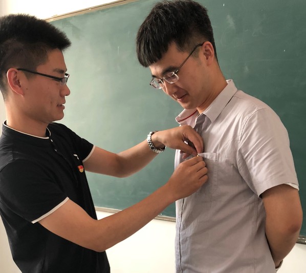 老党员为新党员佩戴党徽(摄影:庞家馨)