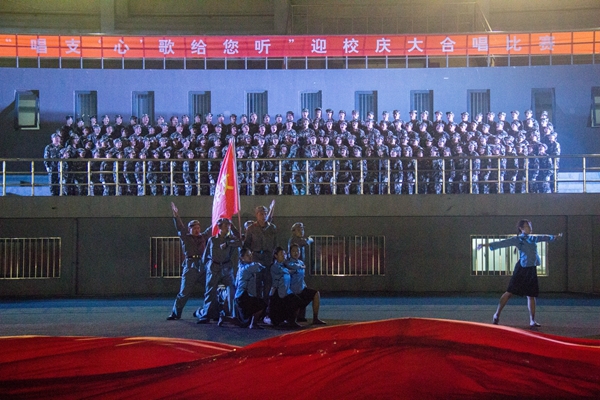 据了解,本次比赛共有十二个军训团参加。除《北京石油学院之歌》外,各院系均将红色歌曲作为选唱歌曲,以示对红色岁月的缅怀。在演唱过程中,各团还增加舞蹈表演、器乐演奏等丰富的表现形式以增强表演效果,烘托表演气氛。其中,我院选择了《飞跃大渡河》作为演唱曲目,并配以高难度的舞蹈表演和精心编排的动作展示。台上,学生们卖力地歌唱着,歌声嘹亮;指挥动作铿锵有力,十分到位。台下,红色的绸缎作河水涌动之状,随着表演不断起伏;舞蹈演员舞姿优美,表演投入。精彩的表演吸引了评委和观众的目光,掌声和喝彩声连成一片。