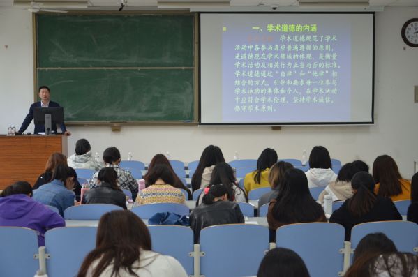 10月22日下午2时,文学院举行“科学精神与学风建设月”开幕式,邀请马克思主义学院张荣华教授在南教119室做了题为《严守学术规范,恪守学术道德》的讲座。文学院研究生辅导员梅琳以及部分研究生参加了此次讲座。