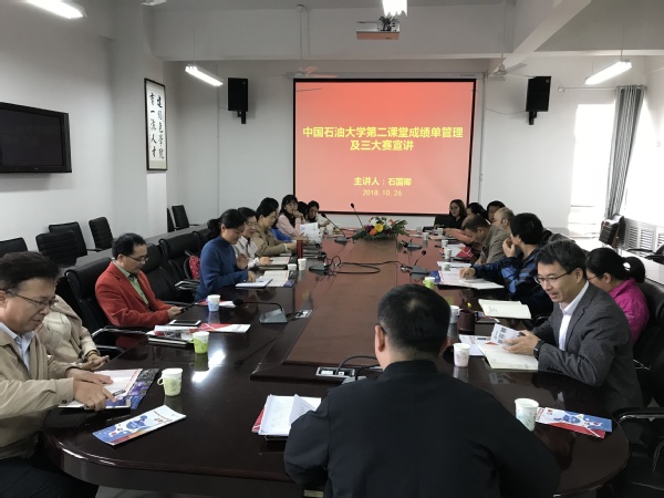 10月26日下午,学院在文理楼358召开第二课堂成绩单管理及三大赛宣讲会,特邀校团委副书记石国卿为学院教师、学生代表介绍第二课堂成绩单及三大赛的相关情况。学院副院长韩淑芹、各年级班主任、部分教师和学生参加,学院团委书记赵振华主持会议。