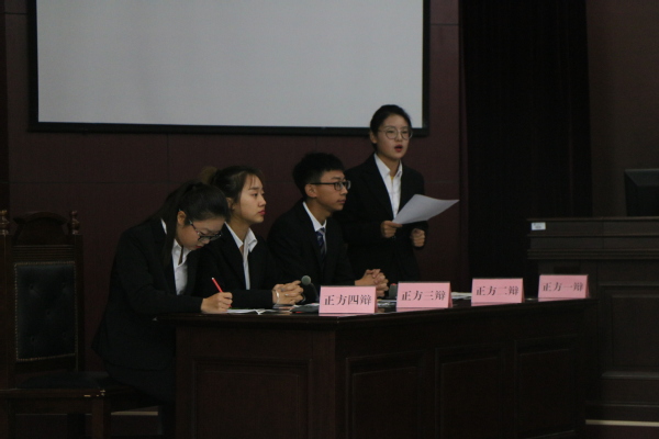 整场比赛采用华辩赛制。具体程序有立论陈词与盘问,驳论与对辩,盘问与小结,自由辩及总结陈词阶段。首先上场的是英语1803代表队和汉语1801代表队,他们以10月28日发生的重庆公交车坠江事件为基础,围绕“是道德建设还是制度建设更有助于避免灾难的发生”展开激烈辩论。他们用形象生动的案例,真实有效的数据,寻找对方的逻辑漏洞,不断对对方的观点进行驳斥。