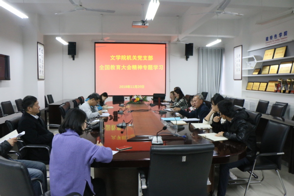 11月20日,院机关党支部在文理楼358会议室专题学习全国教育大会精神。院党委书记张永宁,党委副书记邹维忠,院机关党支部相关成员出席本次会议。