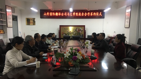 山外国际语言翻译服务有限公司&文学院校企合作签约仪式于12月20日下午四点在文理楼358顺利举行。山东外贸职业学院商务外语系王应喜主任等一行四人与会,文学院王学栋院长、孙大满副院长、王新博副院长、邹维忠副书记等出席了签约仪式。
