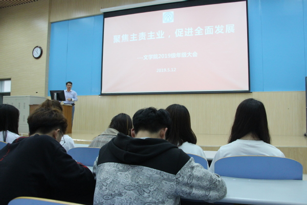 5月12日,以“聚焦主责主业,促进全面发展”为主题的文学院2018级年级大会于南教楼300室召开。大会由文学院2018级辅导员赵振华主持,兼职辅导员丁晓方、文学院2018级全体学生参加此次会议。