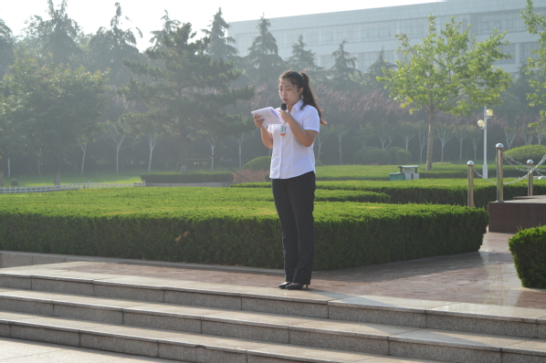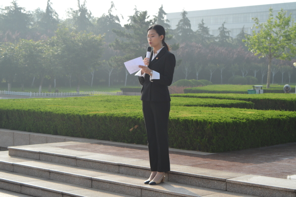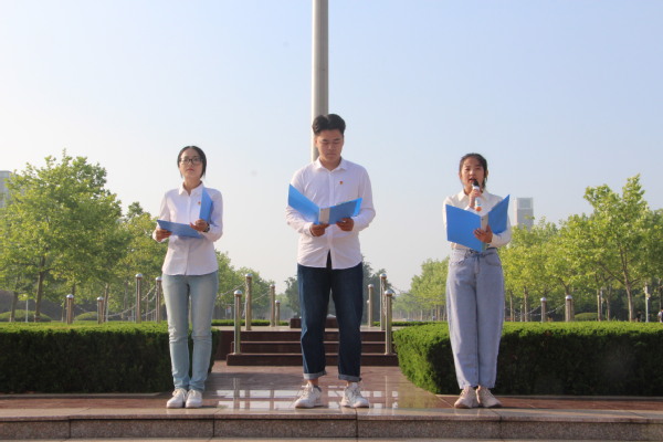 高鑫铭宣布升旗仪式正式开始,全体立正,向国旗行注目礼,并奏唱国歌。嘹亮的歌声与笔直的身躯,彰显了青年人的青春活力。研究生代表汪文华、本科生代表靳雅萱和刘厚旺进行国旗下讲话,三人从“泱泱大国,五彩华夏”“名士风流、心忧天下”“精忠报国、匹夫强志”三方面谈起,呼吁青年师生勇担责任,将满腔热血化为实际行动,献礼祖国。我院团委副书记丁晓方做《不忘初心,继往开来,青年勇担责》演讲。她梳理中华人民共和国成立七十年历史,举例展示我国发展成就,最后以总书记对青年的寄语作结,希望青年牢记总书记嘱托,建功立业新时代。“希望你们能不负韶华,以梦为马,无愧青春。”她如是说。