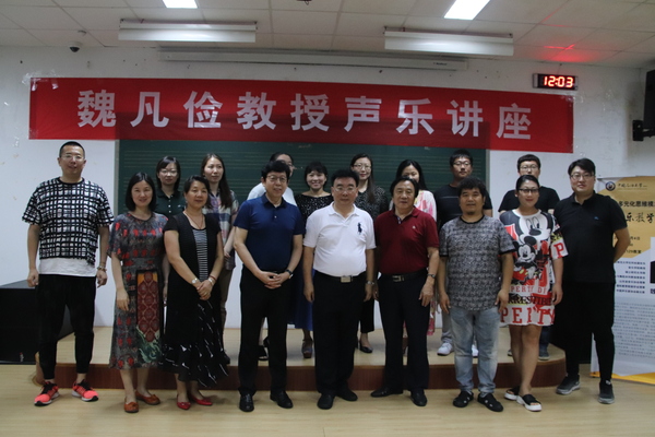 7月4日,“音乐大讲堂”活动讲座——“构建多元化思维模式在声乐教学中的重要性”在音乐系129教室举行。本次讲座由中国声乐家协会副主席、山东省音乐协会理事、山东师范大学音乐学院魏凡俭教授主讲,青岛声乐协会会长、青岛大学声乐教授韩乃舜老师,中国海洋大学教授孙道东、郑琳、隋天开老师,山东科技大学艺术学院副院长刘寿臣教授、匡传英老师和管成峰老师以及我校文学院音乐系师生参加。