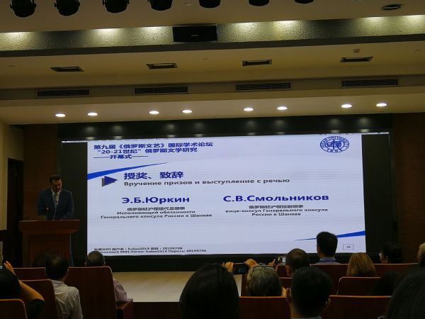 适值中俄建交70周年之际,为了在中国高校俄语专业学生中推广当代俄罗斯文学的阅读和研究,俄罗斯驻沪总领馆联合复旦大学俄语系举办了“阅读当代俄罗斯文学”大赛征文。来自莫斯科大学、北京外国语大学、北京师范大学、南京大学、厦门大学、浙江大学、黑龙江大学等70余所国内外高校的俄语专业学生参加了征文活动。参赛文章要求是研究当代俄罗斯文学的学术论文,应符合学术规范。大赛共有200余篇论文参与评比,经过国内外专家评委的投票,最终产生一等奖1名,二等奖3名,三等奖5名。我院外国语言文学(俄语)2018级硕士研究生孙铭泽的论文《扎·普里列平小说《萨尼卡》的宗教意蕴论析》在此次征文比赛中脱颖而出,斩获佳绩,获得大赛二等奖。颁奖仪式于7.6日在复旦大学举办的第九届《俄罗斯文艺》国际学术前沿论坛期间举行,俄罗斯驻上海领事馆总领事亲自为获奖者颁发证书和奖品。