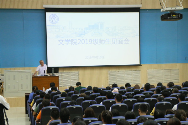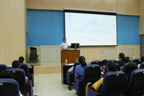 9月10日,文学院召开2019级师生见面会。院长王学栋,党委书记张永宁,副院长孙大满、魏学宝,各专业系主任、支部书记、各班班主任等老师出席会议,2019级全体本科生和研究生共同参加。会议由文学院党委副书记邹维忠主持。