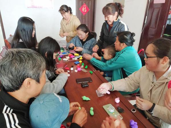 社区奶奶正在志愿者的教学下为孩子捏太空泥 陈嘉婷摄