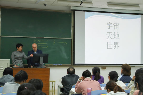 “大家好!”科布杰夫教授用中文向大家问好,在场师生报以热情的掌声,讲座氛围十分活跃。科布泽夫教授首先做了简单的自我介绍,随后便切入主题——中国文化在俄罗斯的传播。科布泽夫教授的讲座主要围绕以下三个部分展开。第一,科布泽夫教授从Китай(中国)词的起源开始,梳理了三百多年的俄罗斯汉学历史。第二,科布泽夫教授通过对汉语汉字的列举分析,引申到东西方文化的共同点及区别差异性,展现出世界文化的多元性与可交融性。第三,科布泽夫教授从哲学的角度,较为系统地分析了我国传统文化中的阴阳“两极”观点,通过举出生活中的事例,肯定了“两极说”的合理性。最后,孙大满作总结讲话,对科布泽夫教授的到来演讲再次表示感谢。