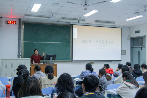 11月14日,北京大学教授赵桂莲于南教楼116作了题为《俄罗斯文化神秘性探源》的学术讲座。此次学术讲座由文学院副院长孙大满主持,系主任周瑞平,青年教师孟宏宏、赵婷廷、赵小华、姜训禄以及来自院内外100余名学生聆听了此次学术报告。