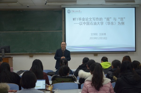 12月18日下午,中国石油大学(华东)文学院副院长,硕士生导师王新博教授在南教117室作了一场题为“MTI毕业论文写作的‘规’与‘范’——以中国石油大学(华东)为例”专题讲座,本次讲座由研究生教学管理部副主任徐小雁老师主持,研究生教学管理部主任淳柳老师及我院翻译硕士到场聆听了讲座。