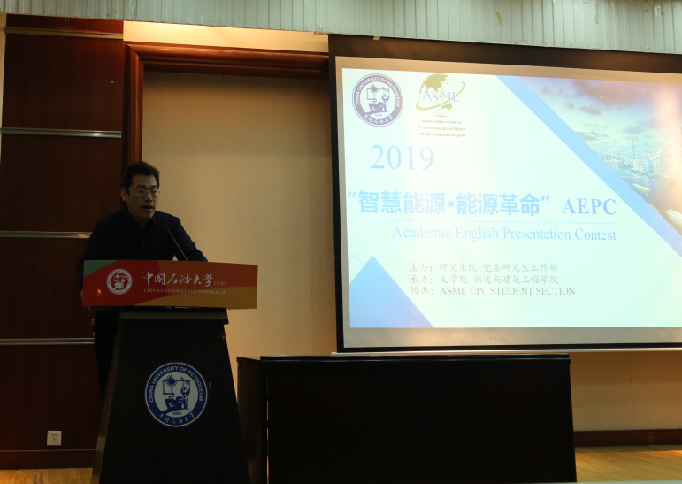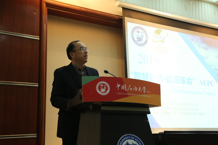 为助力双一流建设,提高研究生的国际学术交流能力,培养拔尖创新人才,由研究生院、储运与建筑工程学院、文学院及ASME UPC学生分会联合举办的“智慧能源·能源革命”2019 Academic English Presentation Contest (AEPC)总决赛于2019年12月19日晚在西环301成功举办。储运与建筑工程学院副院长刘刚教授、文学院副院长王新博教授出席比赛并致辞。外籍专家Russell Schrantz,文学院徐万治教授、武学锋教授、郭月琴教授等7位老师受邀担任此次比赛的评委。由李德凯、原欣、马爽等人的Aoligei小组以极其优异的表现斩获了本次AEPC比赛的特等奖,季春晖、殷布泽、孟超敏等人的Delta、Future、Gorgeous Laru小组获得一等奖,李晓洁、张玉鹏、秦凯娜、孙喜同、聂飞、孟子龙、杜翔睿、魏凡智等人的8支团队获得二等奖。