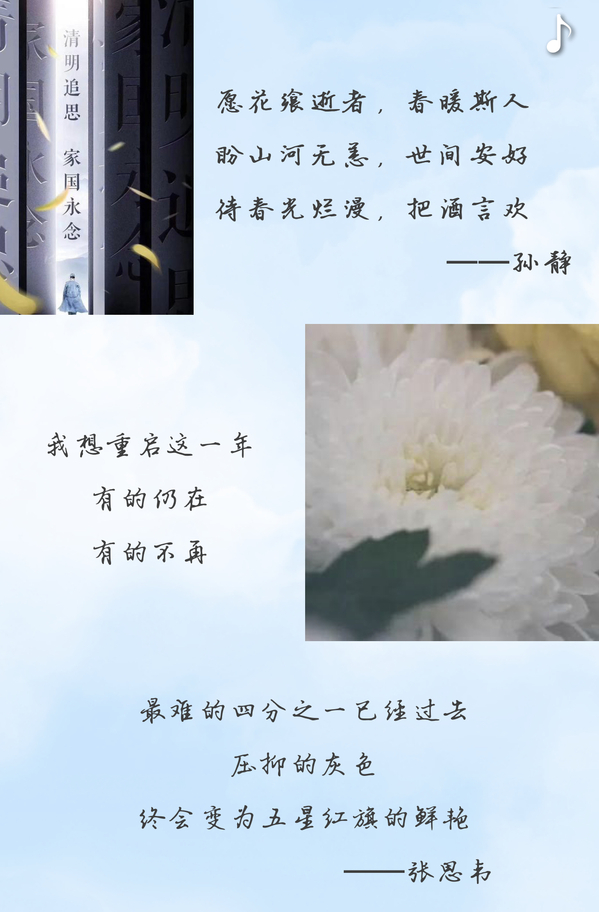 清明节是进行革命传统教育和传统美德教育的极好时机,为引导团支部成员在慎终追远、缅怀先辈的情怀的认知,继承理想、坚定信念,汉语1802团支部于4月4日在线上开展了线上纪念革命英烈的活动。此次活动分为两个环节:第一,由团员朱添慧做“追思与铭记”的主题报告;第二,清明三行诗作品征集。