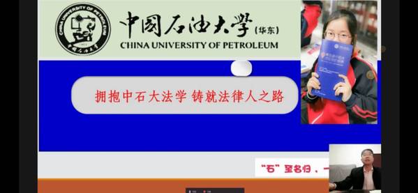田国兴副教授结合石大特色,分别介绍了“选择中石大法学的理由”和“中石大法学前景”。他从石大法学专业历史、师资力量、就业状况、教育设施、学习内容和学生培养、招录情况多个方面阐述了选择石大法学的理由。他说道:“石大法学成立已有二十多年之久,培养法学人才众多,学生就业率也很高。”他还引用了现就职于外交部的2011级学生王渊洁的回忆,“当掌握了‘法律人’的思维逻辑时,会打开看待这个世界的另外一个视角。石大法学系所有博学、可敬和可爱的老师们会倾囊相授他们的一切。”他也从专业的角度展望了中石大法学的发展前景,让观看直播的高中学生对石大法学心生向往。最后,他从优势学科、杰出校友、就业状况和地理优势等方面介绍了石大优势,让观众看到一个实力雄厚、蓬勃发展的今日石大。