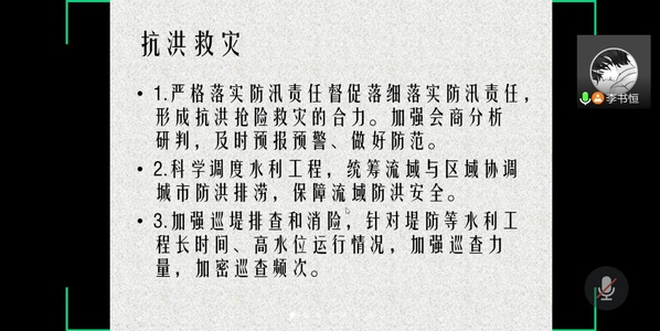 会议伊始,李书恒向全体支部成员介绍中国疫情防控的五点要求,即“严防死守,把疫情控制在武汉”“紧盯全国面上工作,坚决落实疫情防控措施”“全力救治伤者”“做好信息发布和国际合作”和“加大疫情防控科研攻关力度”,在李书恒讲解下支部成员更加清晰地明白了何为五点要求;在复工复产这个部分,支部成员通过李书恒的讲解了解了包括稳就业、保居民就业等内容的“六稳六保”政策;在脱贫攻坚这一部分,李书恒同学选用数字和百分比来表现我国脱贫攻坚的成效,;在抗洪救灾部分中,李书恒同学向我们展示了我国目前抗洪的主要措施,这让我们更加坚信我们的祖国必会渡过难关。在最后分享交流环节,支部成员周治君向支部成员分享了四川的疫情防控独特策略,同样支部成员倪睿也讲述了在新疆疫情加重下乌鲁木齐只用一个晚上封城的事迹。支部成员用自身体会,讲述身边民情国策。