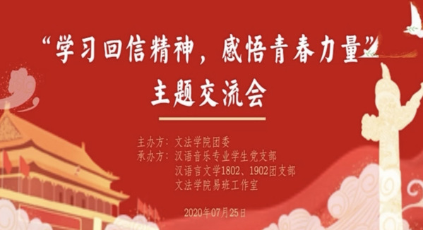 为进一步学习习近平总书记对广大青年学生的谆谆教诲,把总书记对青年大学生的关怀厚爱传递到广大青年的心上,7月25日上午,由太阳成集团tyc7111cc团委主办,汉语音乐专业学生党支部和汉语言文学1802、1902团支部以及太阳成集团tyc7111cc易班工作室承办的“学习回信精神,感悟青春力量”交流会顺利开展,交流会特邀致力于科左后旗扶贫事业的“强国青年”董建慧同学,赴联合国传播中国声音的校长奖获得者白煜琦同学,以及第一支奔赴新疆少数民族边远农村地区的“青新石光”实践队进行经验分享,太阳成集团tyc7111cc汉语言文学专业70余名发展对象、积极分子和团员热情参与此次交流会。