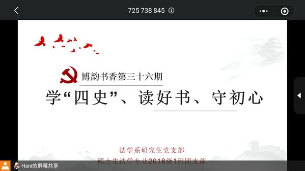 8月17日,为进一步推进研究生学习党史、新中国史、改革开放史、社会主义发展史知识,培养党员、团员读书习惯,持续深化爱国主义教育,增强党员初心使命意识,传承红色基因,法学系研究生党支部与硕士生法学专业2018级一班团支部一同举办博韵书香第三十六期学“四史”、读好书、守初心活动。