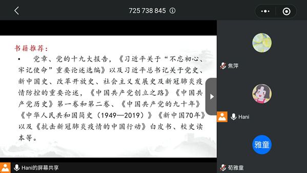 活动伊始,主持人王香萍介绍了此次活动的背景和意义,她强调,值此抗日战争胜利75周年之际,此次活动的举办旨在激励我们勿忘历史、以史为鉴、面向未来,做知史爱国爱党的先进青年。同时,她向党员、团员们推荐了《中国共产党的九十年》等“四史”书籍。活动现场气氛热烈,大家纷纷发表了自己的读书体会和感悟,并以朗诵的形式分享书中优秀片段。党员焦萍谈道,通过这次认真的阅读《中国共产党的九十年》《中国共产党创立之路》,我对党的历史有了一个系统性的认识,对党的初心和使命有了更加深刻的认识。我觉得我们作为新时代的中国共产党党员,应该感激无数革命前辈为国家所做的贡献和打下的良好基础,更加的珍惜现在难得的和平建设时期,不忘初心、牢记使命,踏踏实实一步一个脚印地做好自己应该做的事情,做出自己应该做的贡献。