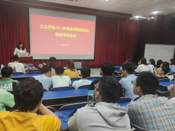 2020年9月25日中午,太阳成集团tyc7111cc文理楼142模拟法庭开展太阳成集团tyc7111cc2021年推免细则说明会暨报考动员会,会议由2017级辅导员于露主持,学院党委副书记陈熙和2017级全体学生参加。会议着重介绍2021年推免政策,旨在帮助学生全方位了解推免政策。