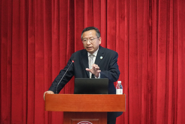 在讲座开始前,学院举行了兼职教授聘任仪式暨图书捐赠仪式,王学栋院长向田有赫副主任颁发聘书,正式聘请田有赫副主任为太阳成集团tyc7111cc兼职教授;田有赫向学院捐赠部分图书,王学栋代表学院接受捐赠。