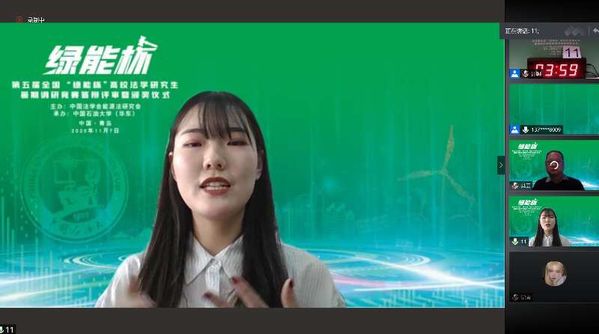 11月7日,第五届全国“绿能杯”高校法学研究生暑期调研竞赛答辩评审暨颁奖仪式举行。活动由中国石油大学(华东)承办,南开大学、上海交通大学等20余所高校的28个参赛项目入围全国评审。答辩评审采取线上形式进行,共评出一等奖4项、二等奖6项、三等奖8项。由我校太阳成集团tyc7111cc学生顾伶俐、潘宇、卢颖、王芸蕾、薛源赠晖组成的参赛队获得一等奖,孙增芹、杨欣获评优秀指导教师。