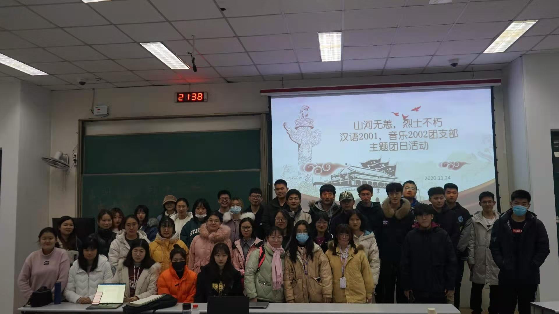 为响应习近平总书记在纪念中国人民志愿军抗美援朝出国作战70周年大会上的讲话精神,2020年11月24日,汉语2001团支部,音乐学(管弦)2002团支部在西环204室联合举办“山河无恙,烈士不朽”主题团日活动。该次活动由汉语2001团支部成员周子豪主持,各团支部成员全部参与。该次活动旨在弘扬伟大的抗美援朝精神,加强爱国主义教育,增强学生的家国情怀,鼓励学生为决胜全面建成小康社会,实现中华民族伟大复兴的中国梦而不懈努力。