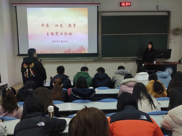 党支部书记孙雪首先阐释了“四史”——党史、新中国史、改革开放史以及社会主义发展史的具体内涵,随后组织支部共同观看大型电视纪录片《为了和平》并鼓励大家分享个人感受。观看完毕,各党员同志主动分享了自己的学习感悟。新党员于文龙表示:“抗美援朝战争是我们党在新中国成立初期领导的伟大战役。党的领导人能在战斗资源短缺、全国上下百废待兴的情况下决定参加这次保卫和平的战争,体现了党全心全意为了人民,令人十分敬佩。志愿军用他们的顽强而无畏的精神战胜了敌人,也震慑了那些曾经侵略过我们的人。无论是多么强大的国家,无论是几星上将,在侵犯中国的主权和领土完整时,中国人民都将奋起抵抗,捍卫祖国和正义。”新党员冯烨文表示:“当我在电视上看到那些经历过朝鲜战争的老兵的沧桑的脸时,我的内心被触动了,我想那便是英雄的模样。他们在充分展现中国人民志愿军英勇无畏不怕牺牲取得胜利的同时,弘扬了爱国主义精神和革命英雄主义精神。他们的功绩不会淹没于时光的流逝中,我们应永远铭记。”