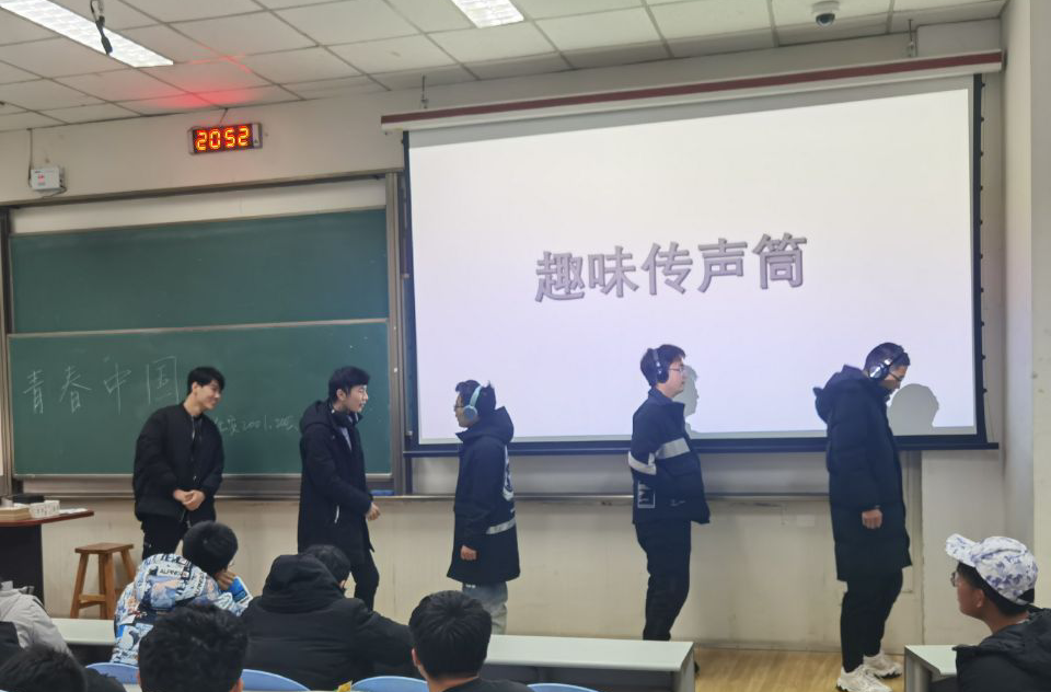 这之后成员们观看了献给新一代的演讲《后浪》,《后浪》通过国家一级演员何冰的演讲表演,以上一代称许的口吻激励当今年轻一代。配合B站UP主的青春影像混剪,《后浪》展现出B站1.3亿年轻人表达自我,拥抱世界的奋斗瞬间,是对年轻一代的认可、赞美与寄语。短片中说“一个国家最好看的风景就是这个国家的年轻人,因为你们,这世上的小说、电影、音乐所表现的青春,就不再是忧伤迷茫,而是善良、勇敢、无私、无所畏惧,是心里有火,眼里有光。”演讲虽短却给成员们带来了很大的感触,它让成员们明白我们作为后浪应不断的奔腾向前,永不止步!最后,在各班班委的带领下,成员们进行了“年轻的中国”主题趣味游戏互动,该活动共包括四个小游戏:有奖竞猜、你画我猜、传声筒、歌曲接力。游戏采用积分制,最终按照成绩高低排序,成绩高的同学会获得相应奖励。同学们积极参与,不仅在游戏中展现个人风采,也将团队协作这一精神充分发挥出来。