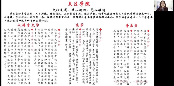 团队成员在队长侯昊杉组织下细致分工,在学校发放的宣讲资料基础上增加了制作精良的校园概况系列视频以及幻灯片,以增加线上宣传的趣味性与吸引力。负责的团队成员提前与宣讲院校取得联系,通过校方同意后对宣讲对象进行需讲解问题的采集。其后团队各成员对流程安排多次讨论并修改完善宣讲流程,细致推演线上宣讲活动过程,确定最终方案。