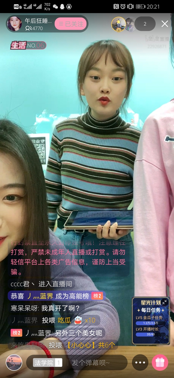 “Oh my god,买它买它!这是来自科左后旗的特色产品——奶锅巴,有很浓的奶香味,老人和小孩都可以吃”,来自汉语1902班的高波正在向屏幕前的观众介绍特色产品,“如果你喜欢吃酸的,就买它;如果你喜欢吃甜的,更要买它!”团队在直播期间不时会向观众献上才艺,一首歌曲“好运来”更是将直播间的氛围推向高潮,引发了观众的刷礼物狂潮,两个小时的销售额达500余元。