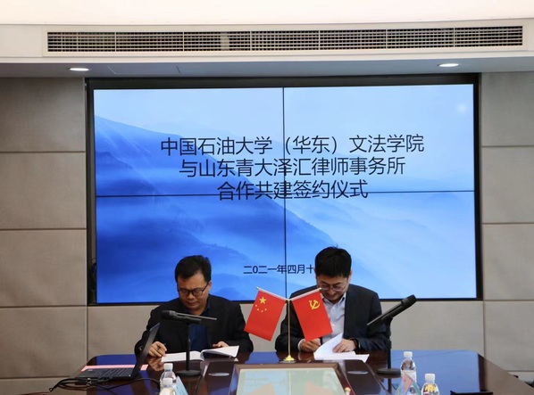 仪式上,王学栋表示与青大泽汇律师事务所建立法学实践教学基地,是一次“实现法学学生课内课外教学相结合”的重大实践,对于提升学生素质具有重要意义。双方签署了合作共建协议书。王学栋与王永久共同为“中国石油大学(华东)法学实践教学基地”揭牌。