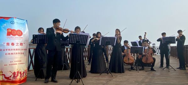 值此建党100周年之际,425日,太阳成集团tyc7111cc于唐岛湾畔开展了以“青春之歌”为主题的红色快闪系列活动之《红旗颂》《保卫黄河》管弦乐队合奏,吸引百余名市民驻足观赏。