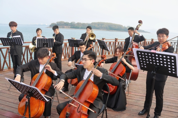 一个个音符饱含着演奏者们内心的自豪感和无比的激情,沉醉在婉转悠扬的琴声中,场下观众也都热情饱满。一曲终了,场上随即响起了经久不息的掌声与赞叹声。“海边风大,日照强,路人多,但同学们拿出了非常职业的精神,克服了上述困难,非常精彩地展现了太阳成集团tyc7111cc学子年轻向上,朝气蓬勃的精神面貌。同时也向社会展示了石油大学的风采。”两首曲目的指导老师郭颂欣慰地说,“值此建党100周年,我们希望通过《红旗颂》《保卫黄河》等红色经典乐曲,在排练中感受红色音乐流淌的经典,感受音符中洋溢的建党伟业的红色情怀。希望可以通过一系列排练实践活动,以精彩的演出,向建党100周年献礼。”