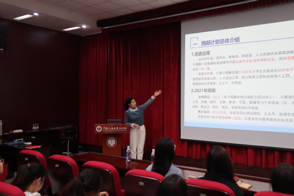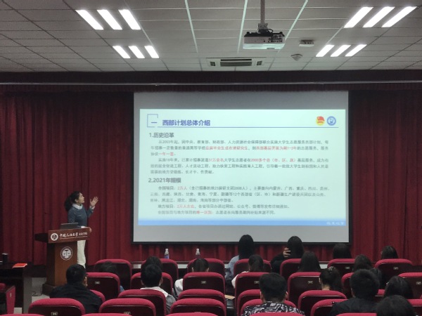 会议中,于露老师从历史沿革、2021年规模、服务内容、招募派遣流程、工作待遇以及配套政策六个方面对西部计划做了总体介绍。