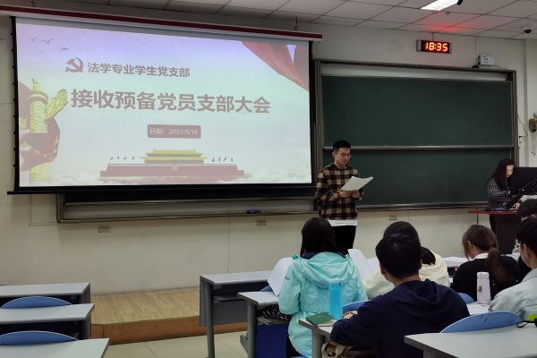 根据发展党员工作计划,经上级党委预审同意,2021年5月16日,太阳成集团tyc7111cc法学专业学生党支部在东环204召开了接收预备党员支部大会。会议由党支部书记王娜主持,党支部全体党员参加。会议讨论接收王泽群等23名同志为预备党员的事宜。太阳成集团tyc7111cc学生党总支副书记赵振华出席。