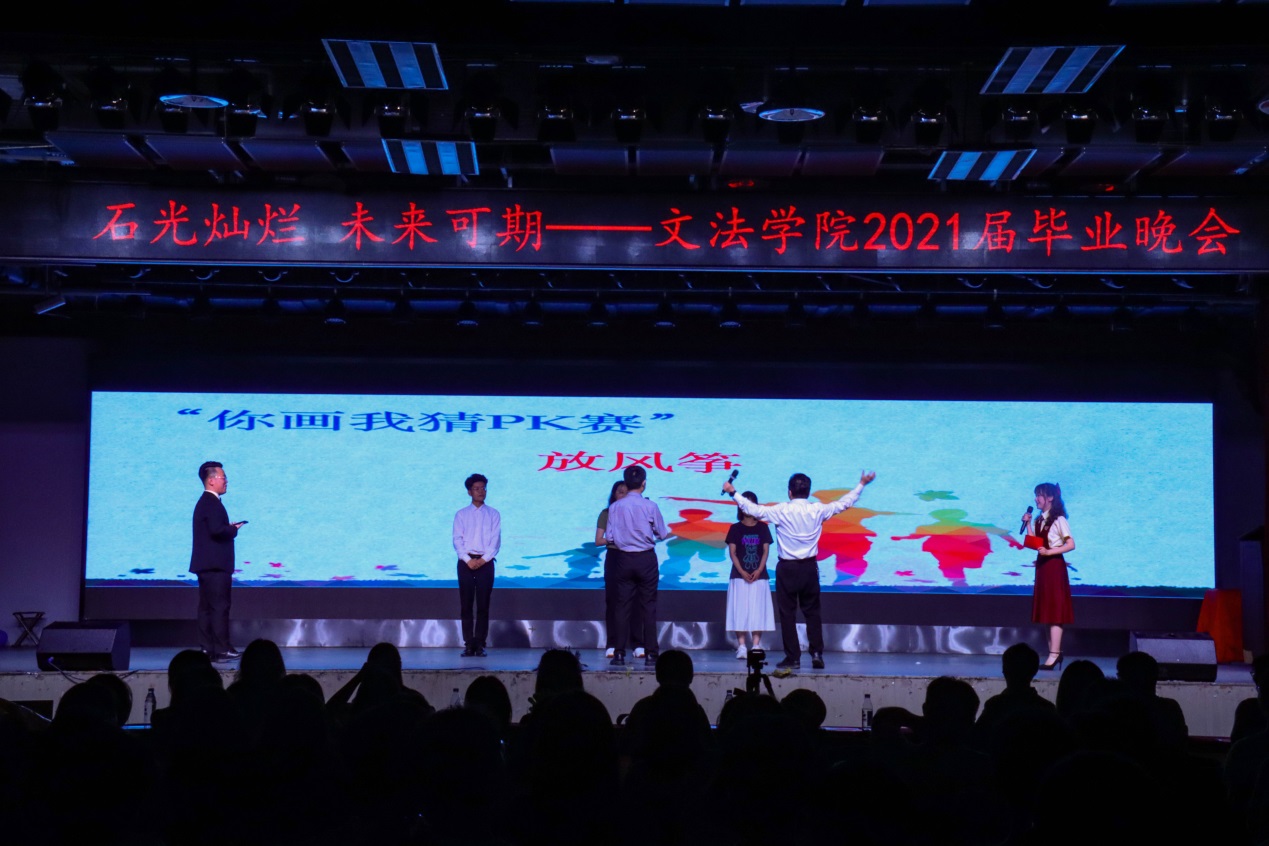 晚会特别设置了游戏环节,学院领导和教师与学生共同参与,不分你我的热闹场景,谱写出最美师生情。“我从未和老师们这么近距离接触过,原来老师们也这么爱玩!希望老师们永远保持这种年轻状态!”中文系毕业生郭建毅感慨道。在主持人的引领下,学院教师在隆重的掌声中上台,一起怀念四载岁月里的柔情。