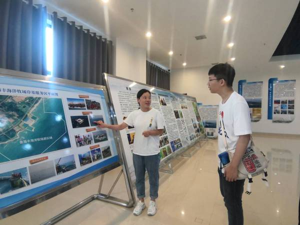 随后,实践队员前往鲁海丰海洋牧场实验基地和展示厅进行参观。企业负责人向实践队员讲述了鲁海丰的发展历程、现有规模和商业模式:“目前,我们和中国科学院海洋研究所、中国海洋大学开展了多个合作项目,并计划进一步加大产学研结合力度,实施科技兴渔战略。”