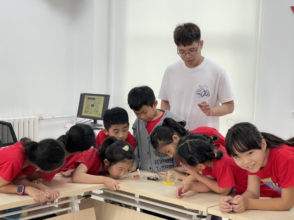 实践队采取“调研+助学”的实践模式,走进公益课堂。实践队队员于天一、 刘永豪、 袁子凝 、陈长青分别开展了不同课程教学。其中由袁子凝开展的天然酸碱指示剂的实验课给学生留下了深刻印象。首先,由你说我猜的小游戏热场,瞬间拉近了老师与学生之间的距离。课程之初,孩子们便表现出了极大的兴趣,对实验的开展表现出了强烈的期盼。课程中所需实验材料包含紫甘蓝、 脉动、 小苏打 、柠檬、 雪碧、 食盐等安全无污染物质。这些实验材料简单易得,在家中就可以完成制备,有利于启发青少年在日常生活中的科学思维,锻炼青少年在日常生活中的动手能力。实验期间学生分组进行对照实验,学生们小心搅拌,专注配制,伴随着紫、蓝、粉这几种颜色变幻的是他们的阵阵惊呼。“我!我!我会!”队员袁子凝在课程最后设置了问答环节,话音未落,小孩子们纷纷举高手臂,后排的甚至从座位上站起来,身体努力地向前倾。这使得他们在有趣的实验中不仅得到了娱乐还学习到了丰富的知识。这堂生动有趣的化学实验课不仅教授课外拓展知识,更激发了探索求知的科学精神和动手能力。“你们明天还来吗?”“下次我们上什么课啊?”“我喜欢你们来!”稚嫩的声音充盈了整个教室,小小的手臂环抱住老师,仰起脸庞,眼神中充满期待。其他队员的课程内容也相继让孩子们在轻松愉快的氛围里得到了许多收获,让他们在兴趣培养、素质提升,能力提高等方面都有了重要突破。