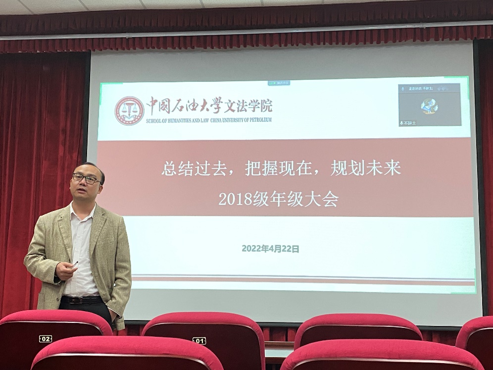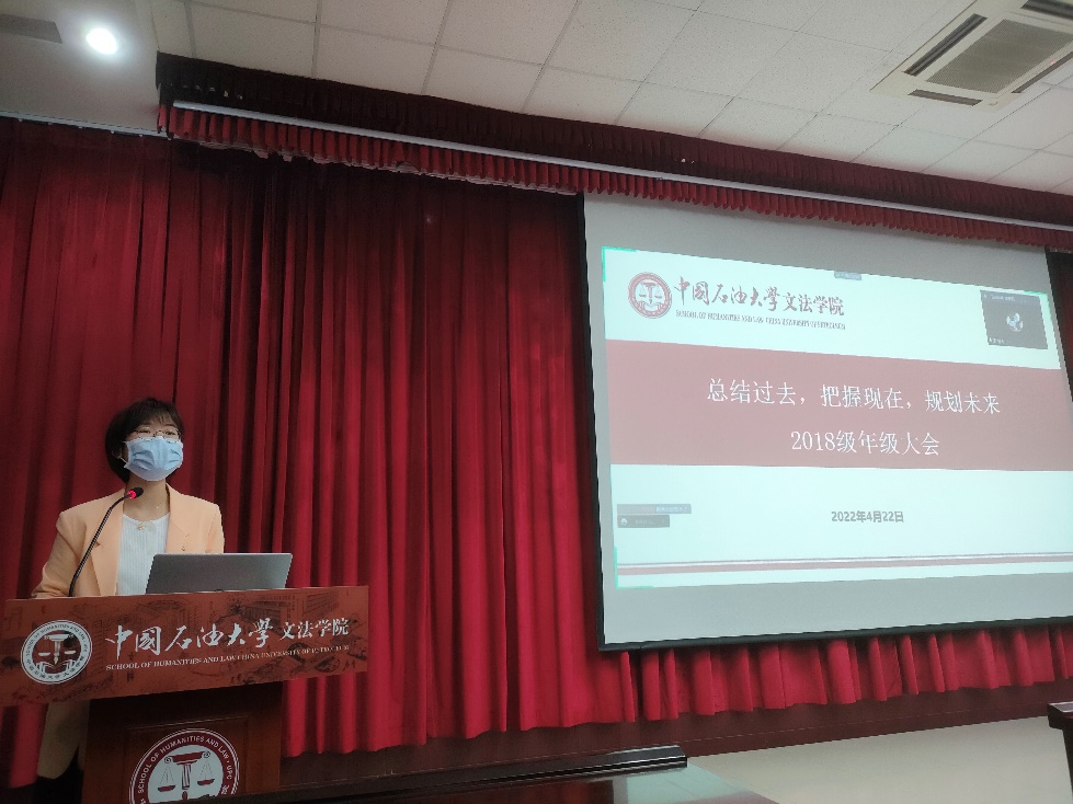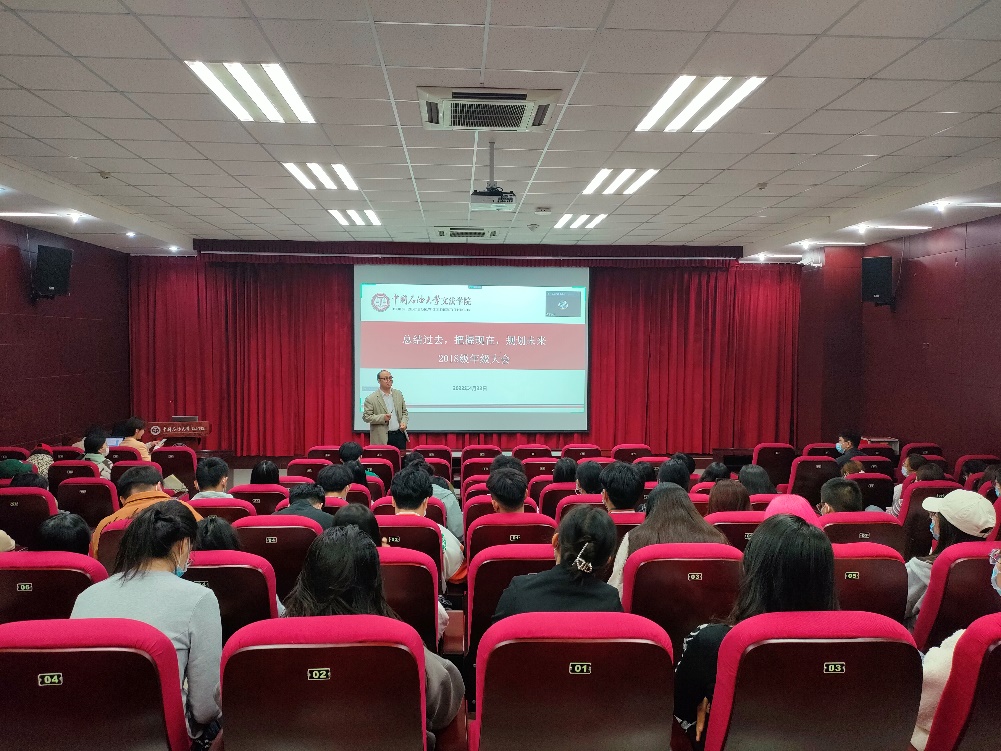 为进一步提升2018级学生对升学、就业形势的了解,激发其热情,引导毕业班走好大学生活最后一程,4月22日,我院于文理楼142召开“总结过去,把握现在,规划未来”年级大会,会议由2018级兼职辅导员宋丽玉主讲,党委副书记陈熙、2018级全体学生参与。