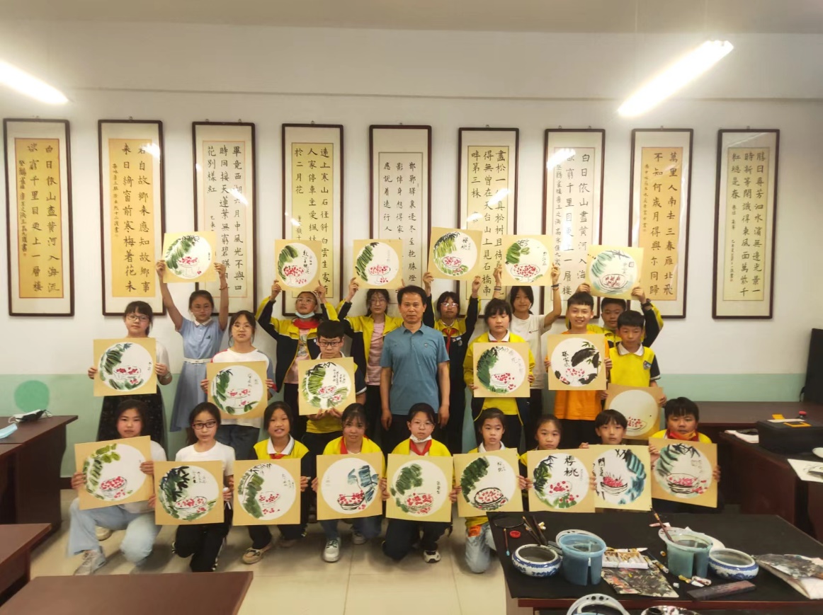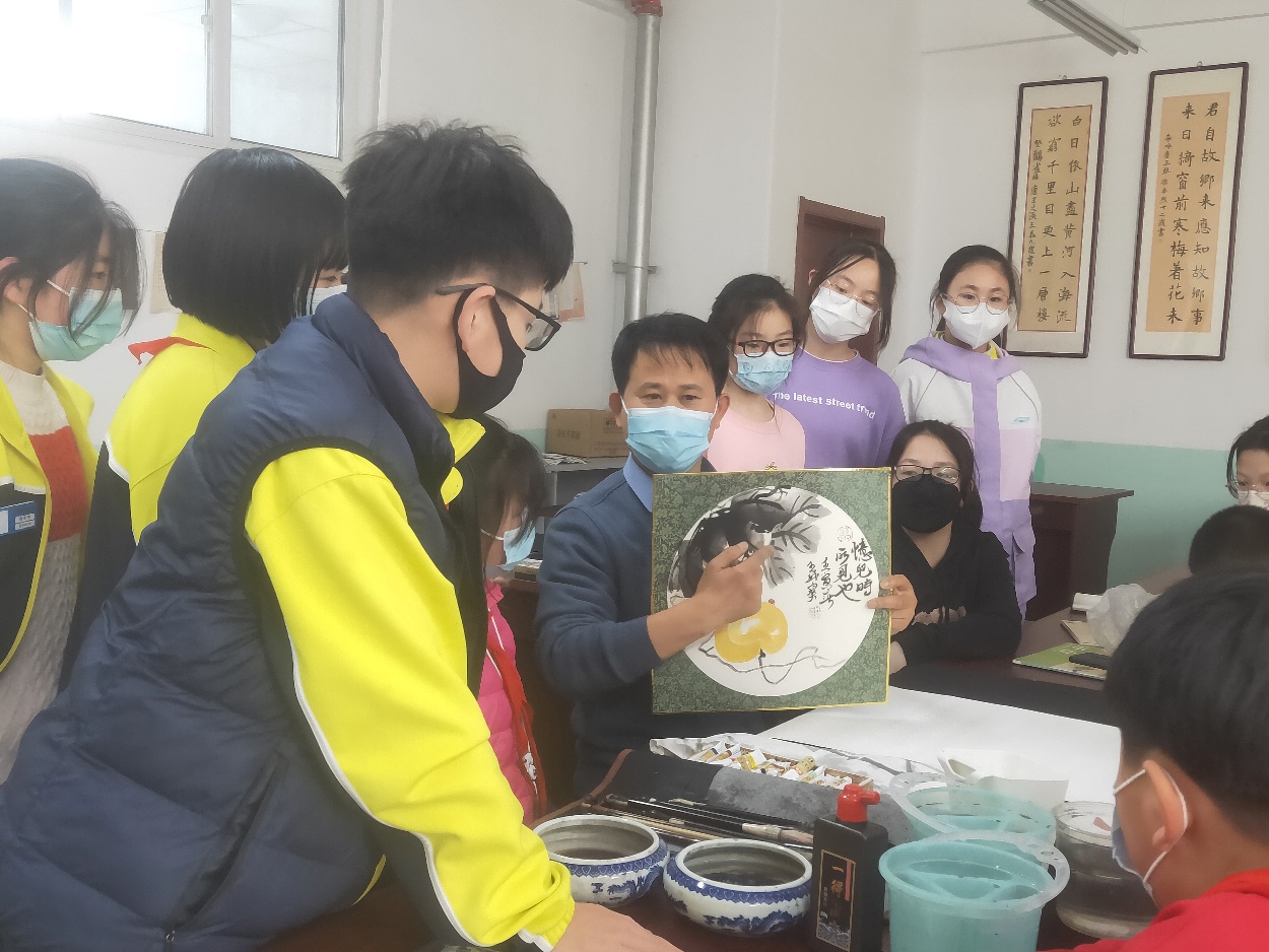 王成宝老师为学生们现场展示《千里江山图》、《富春山居图》、《汉宫春晓图》、《簪花仕女图》等经典名作,并对齐白石、徐悲鸿、张大千等大师画作进行一一赏析,加深学生对中国画的认识和了解,零距离感受中国画的艺术魅力。在总共开展的八次活动中,他不仅生动形象地讲述了中国画笔墨色彩的意境之美、线条造型的神韵之美、章法构图的视觉之美,还现场具体示范“梅、兰、竹、菊”及牡丹、桃花、樱桃、燕子、麻雀等绘画步骤、笔墨特点,耐心的进行绘画指导。同学们均表现出浓厚的学习兴趣,不仅领悟到中国画独特的艺术魅力,感受到中国传统艺术的博大精深,还加深了对中华优秀传统文化的了解和热爱。