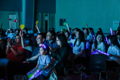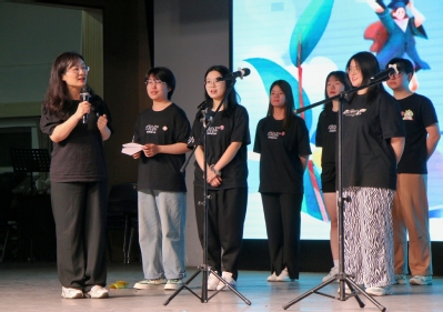 “许多年前你有一双清澈的双眼,奔跑起来像是一道春天的闪电”,法律研1902张宇等人带来歌曲 《你曾是少年》,在场的观众挥动荧光棒,聆听歌曲,回忆着初入大学时青涩的面容,如今即将离去,有诸多的怀念与不舍。