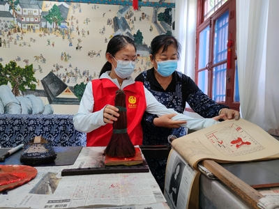 墨与纸的交融,拓印出千年时光之美。在工艺美术大师杨春梅的指导下,实践队员窦艺丹和毛晓彤体验了年画印制过程,一本厚厚的宣纸册,几块各色的版料,日复一日的印制,方可得出一幅幅成品的年画。“年画印制是一项很繁琐的工作,传承人们手工印制年画坚守了初心,一生做一事,值得我们青年学习!”实践队员窦艺丹对传承人们表达了敬佩之情。