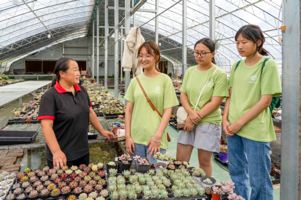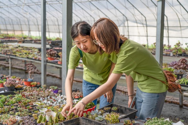 “这些多肉小巧可爱,尤其是肉嘟嘟的叶片!“实践队队员吕皓月对这些颜色丰富、形状多样的多肉充满好奇。根据工作人员介绍,大棚里的多肉品种非常丰富,既有平价、易养的“大众多肉”,也有特殊培育的“高端多肉”,能够满足不同人群的需求。最终实践队队员们也忍不住“剁手”,当场下单了几盆喜爱的多肉盆栽。