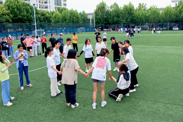 趣味运动会伊始,党委书记姚成郡发表趣味运动会动员讲话,欢迎2022级新生的到来并表示本次运动会将有效融洽师生感情。随后,学生会成员通过示范为22级新生讲解游戏规则,正式拉开了本次趣味运动会的帷幕。本次趣味运动会包括跳大绳,旋风跑和一圈到底三个项目。学院师生们注重团队协作,以饱满的精神状态参与其中。在跳大绳比赛中,各班学生接力上场,各专业讲师更是积极参与其中,为学生摇绳,与生同乐。足球场中间,22级辅导员加入到旋风跑比赛之中,师生们绕过障碍,共同体验奔跑的乐趣。一圈到底比赛中,各专业讲师和学生们手牵手环绕成圈,通过肢体协作,争取在最短的时间内完成传递。