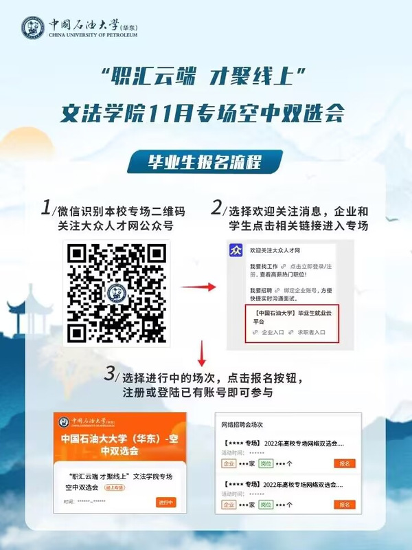 温馨提示:请同学们每天关注微信企业号——中国石油大学(华东)“学生就业工作”栏目,获取更多就业信息。
